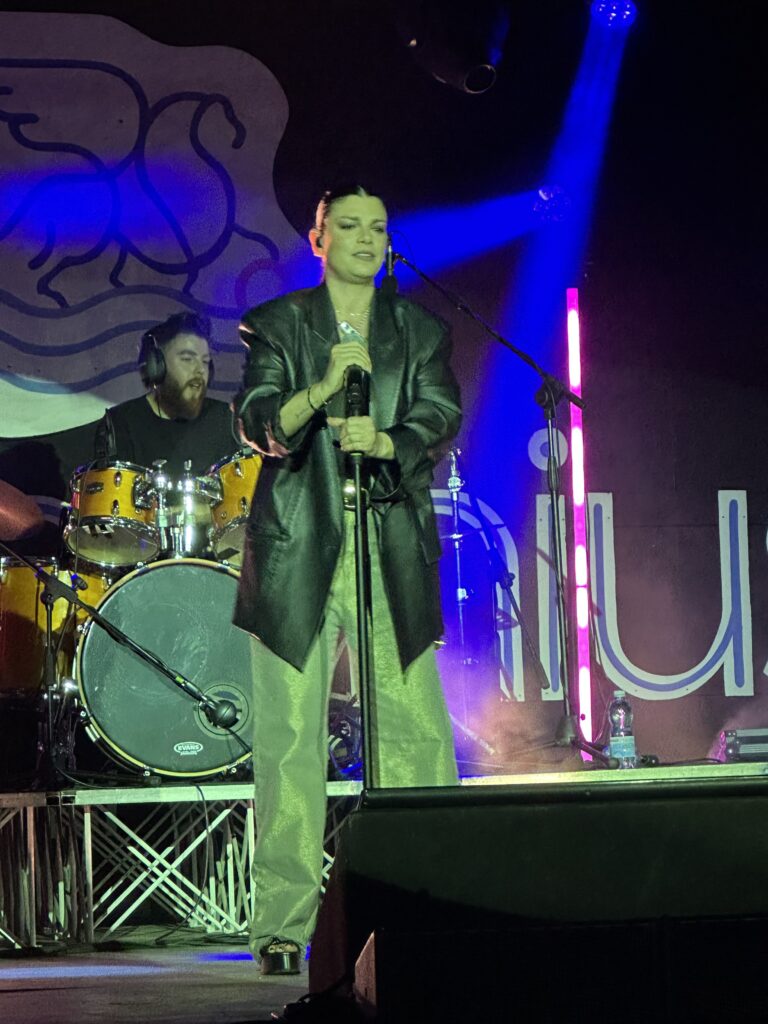 Il live della cantante salentina ha coinvolto tutti, con la sua energia e grinta ha fatto ballare l’intero anfiteatro, ripercorrendo tutti i suoi più grandi successi, da ”Cercavo amore” a ‘Non è l’inferno”, fino ad arrivare al brano scritto da Vasco Rossi intitolato ”Io sono bella’.
